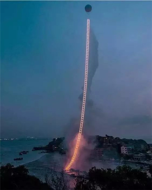 ▲蔡国强在泉州惠屿岛成功“架”起一座长达500米的燃烧“天梯”,