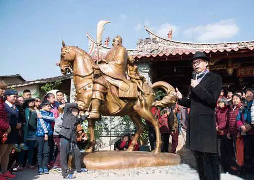 ▲陈文令在传统的关公骑马像的基础上糅合了和平鸽、古代书箱、