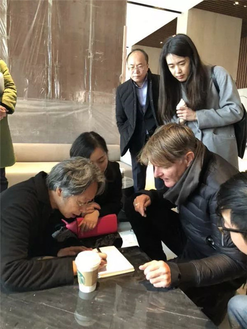 大堂艺术品的创作者卢甫圣老师,和酒店的德国设计团队做了认真而愉快的交流。