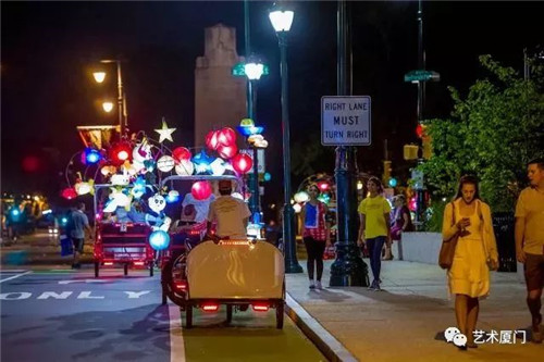 在中国泉州制造,再运到费城,分别组装在27辆人力三轮车上,组成“萤火虫灯带”。