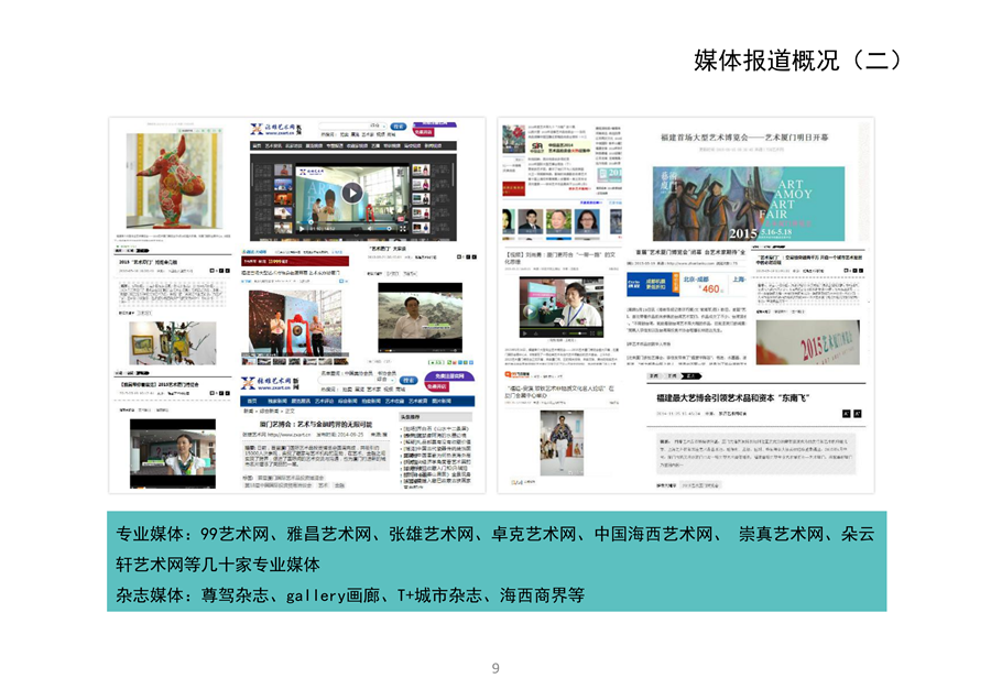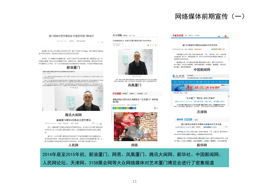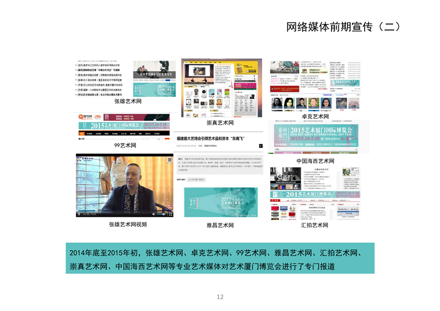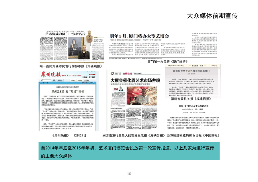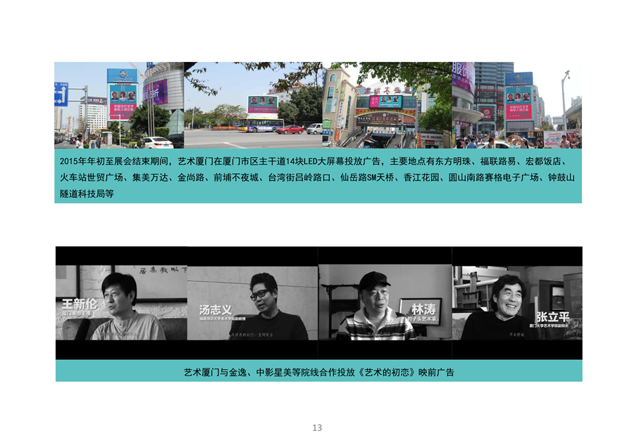 2015年年初至展会结束期间,艺术厦门在厦门市区主干道14块LED大屏幕投放广告,主要地点有东方明珠、福联路易、宏都饭店、火车站世贸广场、集美万达、金尚路...