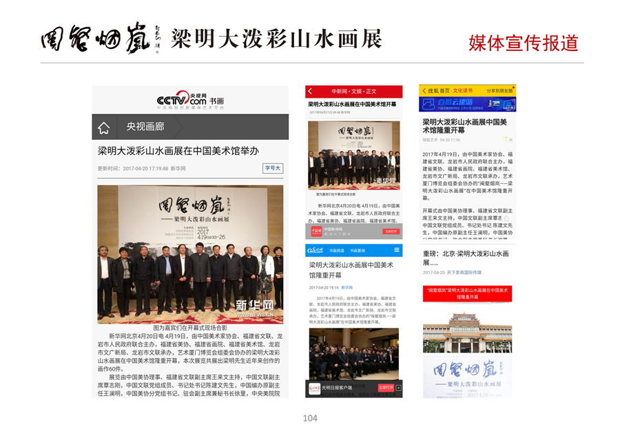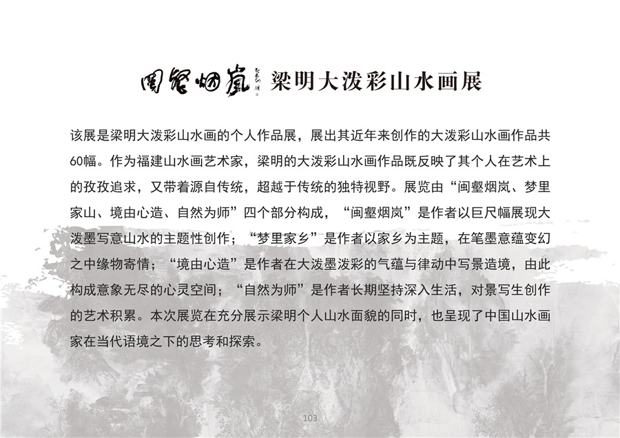 该展是梁明大泼彩山水画的个人作品展,展出其近年来创作的大泼彩山水画作品共60幅。作为福建山水画艺术家,梁明的大泼彩山水画作品既反映了其个人在艺术上的孜孜追求...