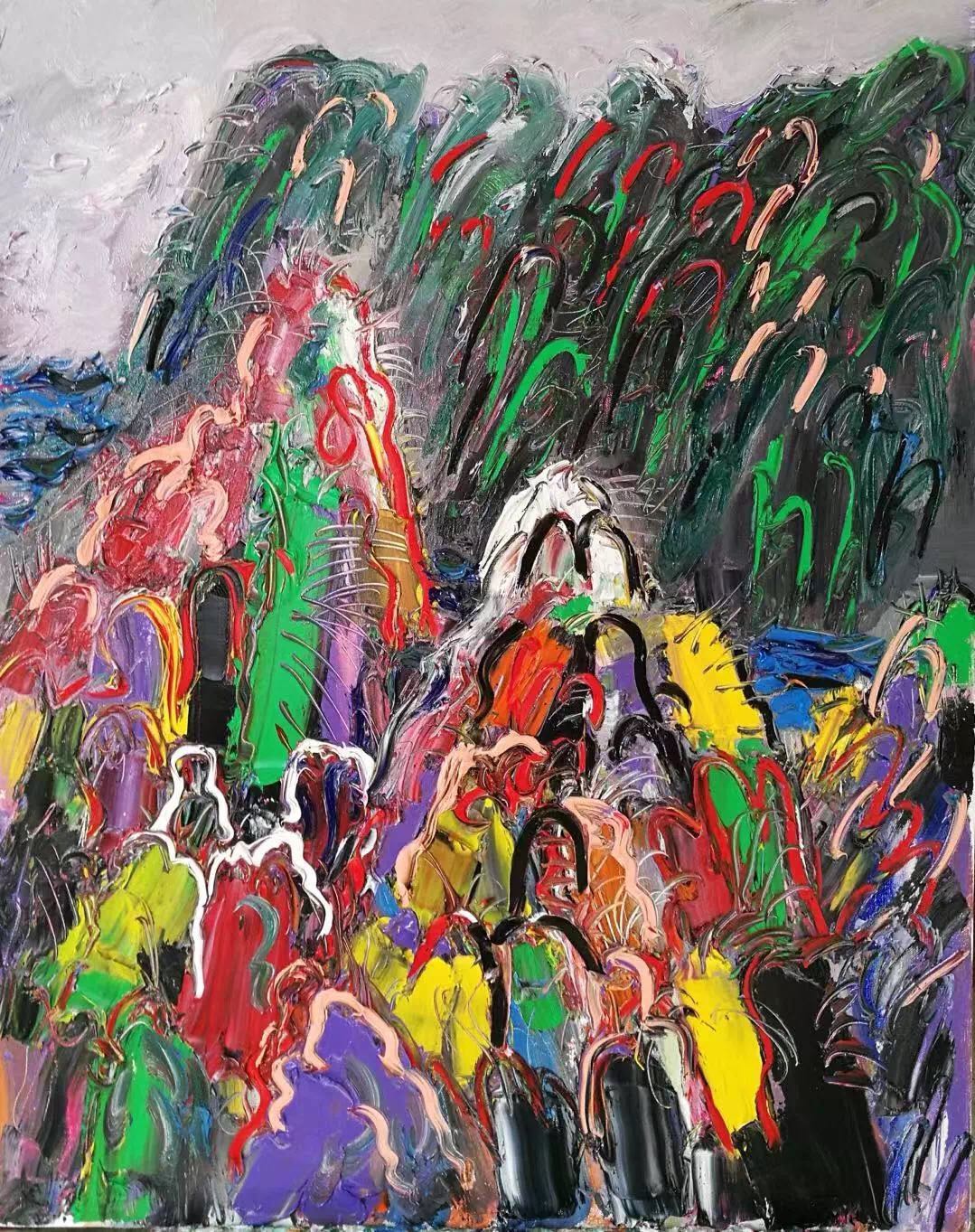如果说李向阳老师是忘我的纯粹,张旭东老师则倾向于热烈地在红尘中打滚。早年他偏居辽宁葫芦岛,大海的波浪翻滚着他的豪爽与热情,他的画作中一点都不掩饰对女性身体以及名山大川海岛的追逐,色彩肆意癫狂,初看你会心花怒放,看久了会热泪盈眶,是用以乐写哀的表现性油画语言来直抵当代人获得欲望满足后泛滥出流离失所的空虚感。正如张爱玲所言:生命是一袭华丽的袍子,上面爬满了虱子。