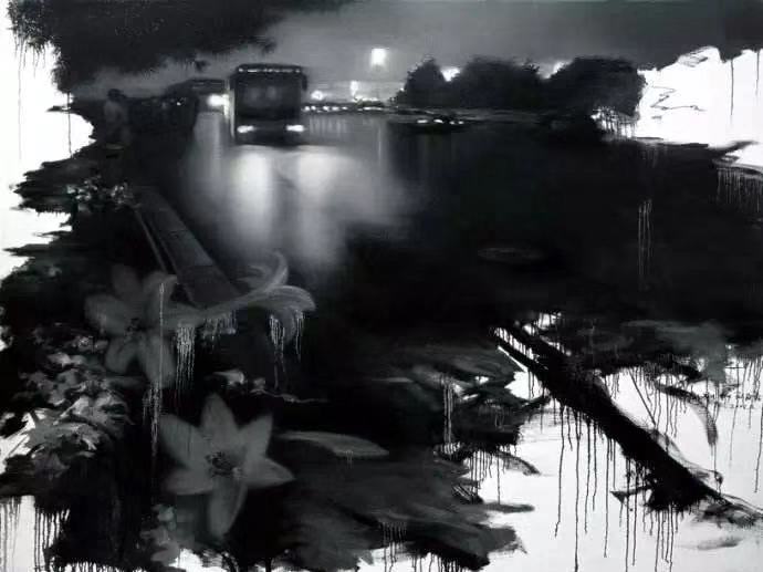 在他的画作中,通常是颓败恶劣的室外公共空间与温暖的室内私密空间形成强烈的反差,你看这幅一束车灯照亮的都市街道一角,散落一地的垃圾堆旁是空空如也的垃圾桶,百合尽管盛放却颓败地倒在角落,一对男女看似紧紧相拥却显得格外的疏离,似乎暗喻着亲密的背后未必是熟悉,也有可能是陌生人,都市的“溃”夜一览无遗。