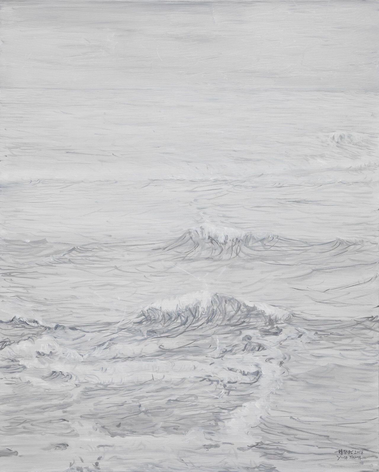 与顾小平的作品有异曲同工之妙,看杨劲松老师画下的大海、山川、云林,看久了内心也会归于平静。这是他用毛笔在油画布上绘制出的大自然,有别于中国传统文人画的“感时花溅泪,恨别鸟惊心”,杨劲松笔下的万物似乎没有情绪,是保持着很客观的笔触,万物皆有性灵,为何它们要依附人的情感而存在呢?