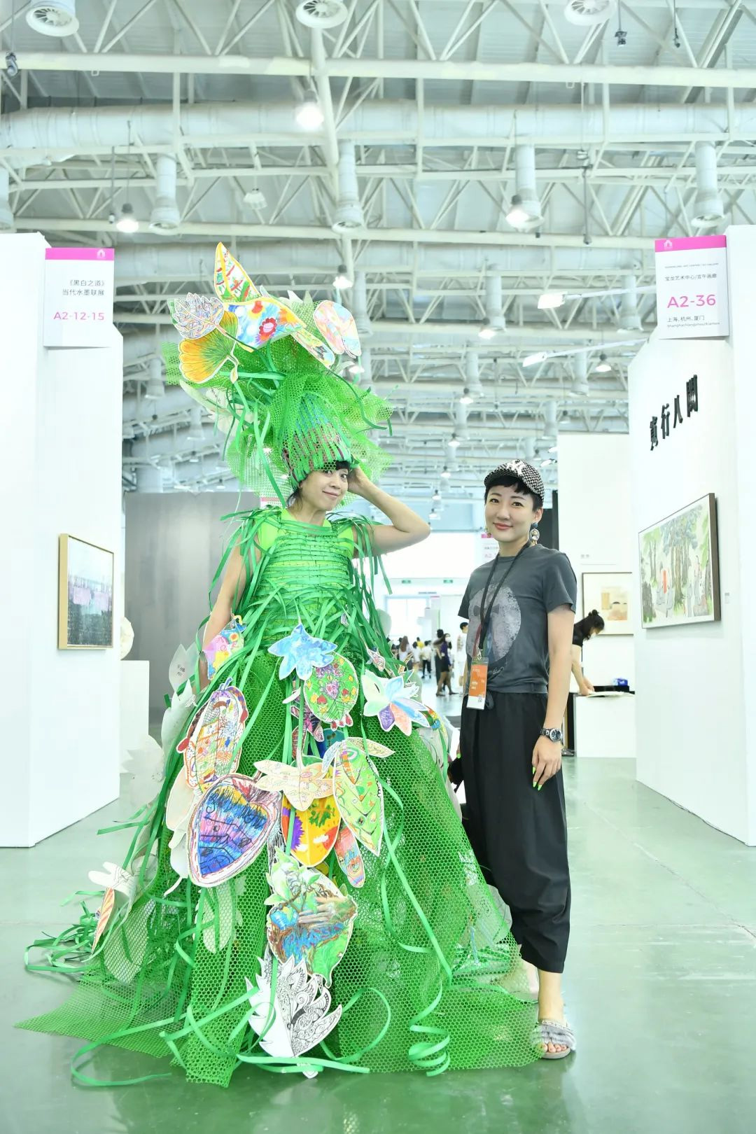 孔宁老师(左一)的行为艺术作品《厦门叶子》,艺术家绿纱裙上缤纷多彩的叶子画作均为厦门小朋友的作品