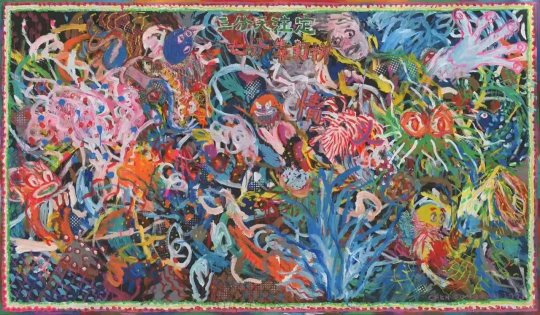 城市肖像之厦门:蓝色的火焰,2021,布面丙烯、油画棒、纸本拼贴,220 x 370cm,48万销售